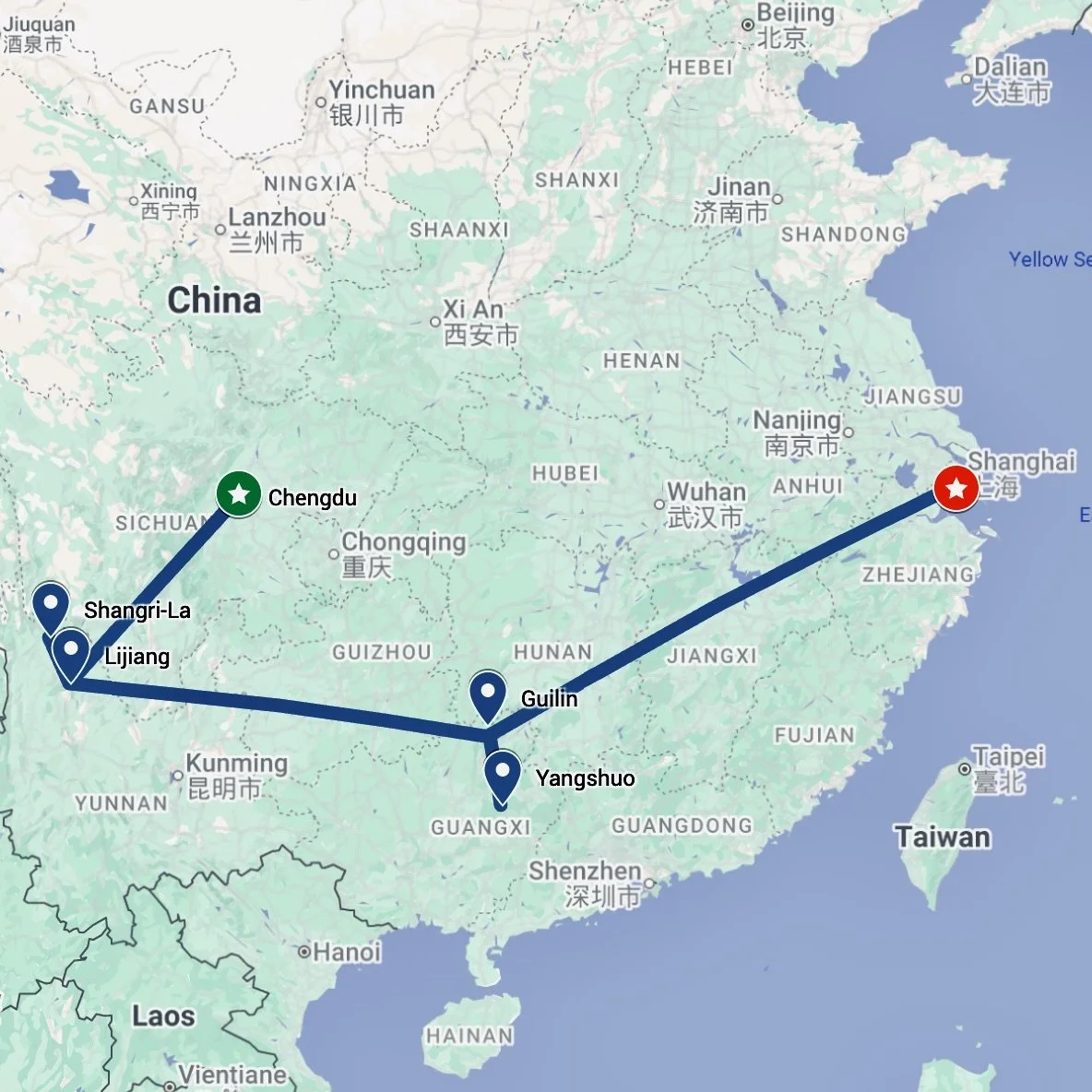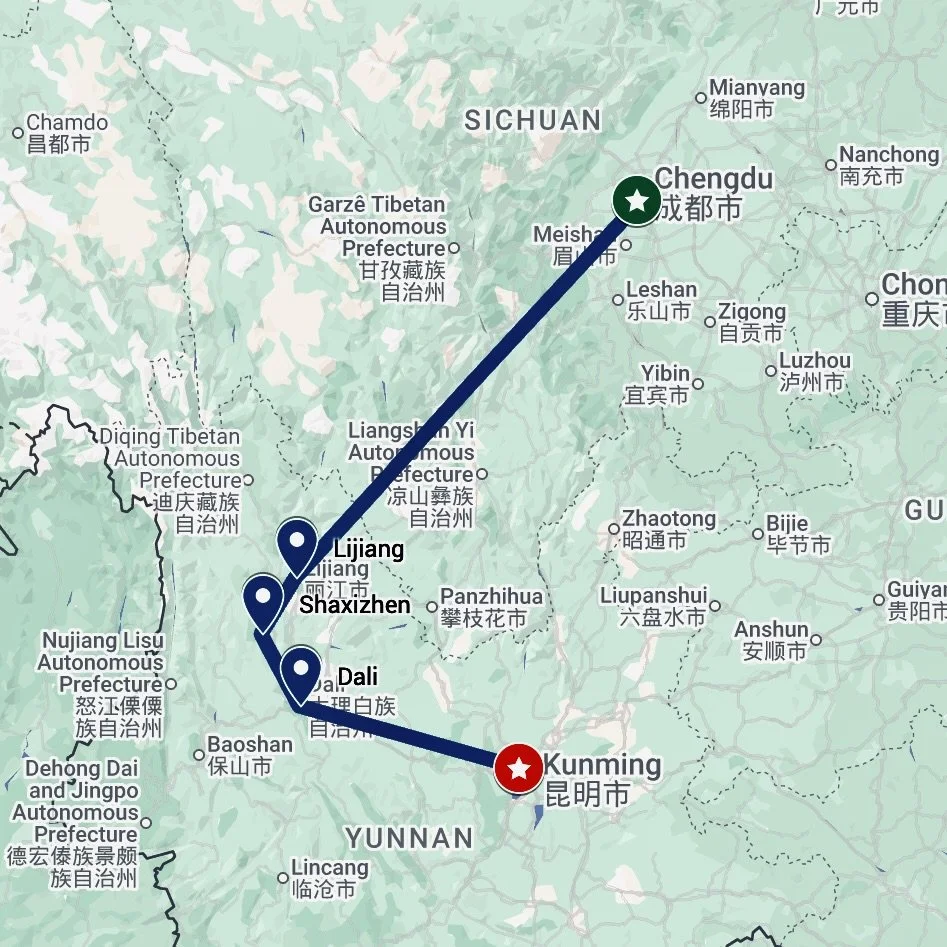 Explore China’s ancient wonders and hidden treasures. Discover the cultural landmarks of Chengdu including Tian'fu Square. Visit the historic streets of Shaxi and Dali before exploring Lijiang’s Black Dragon Pool. Your immersive journey through these lesser known gems concludes in Kunming.